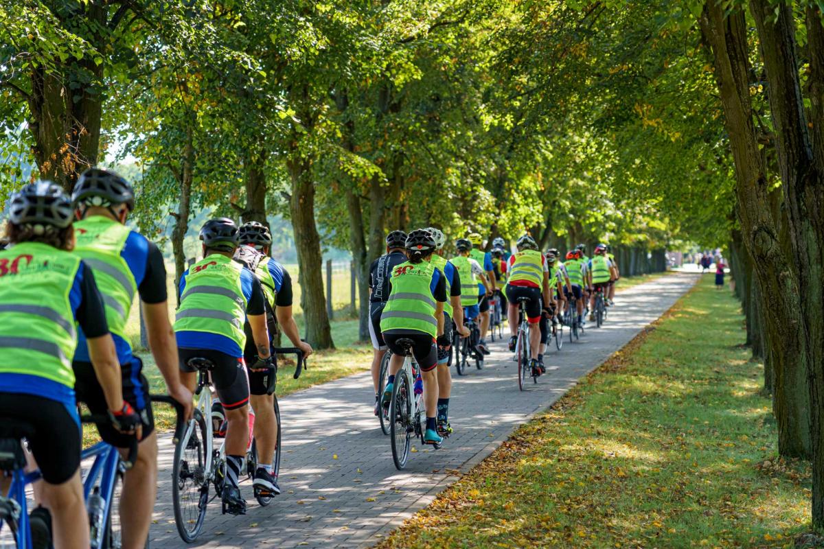 A cycling race with participants displaying the logo of the Chance for the blind Foundation.