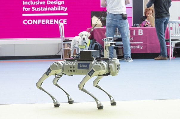 A canine guide dog stares down its robot equivalent at the 2023 Conference